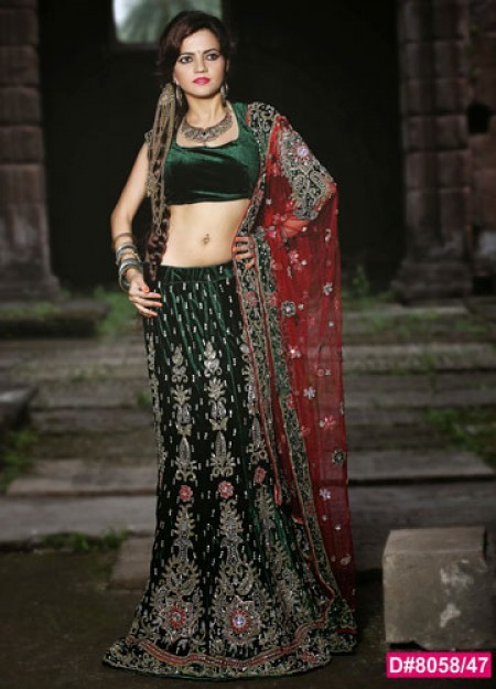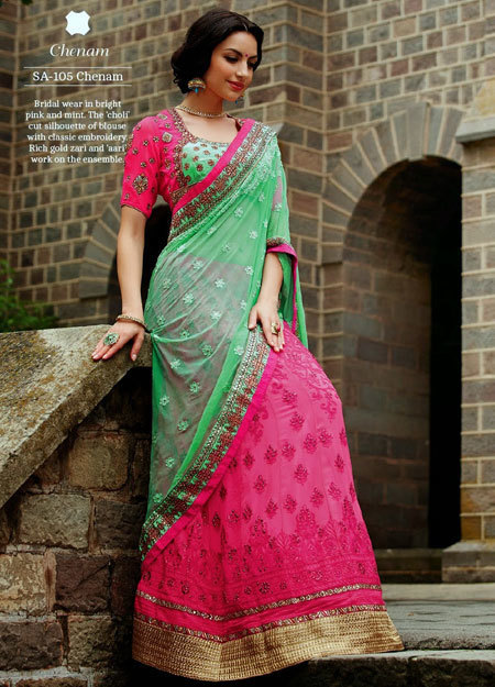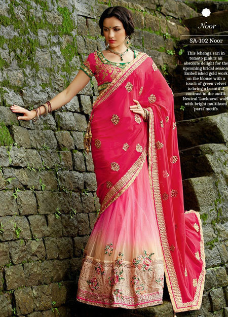 It is essential blend of custom and modern. This outfit is consider made of three cloth piece one is the blouse which is designed beautifully with a various pattern of neck such as U shape neck pattern, V-shape neck pattern, Backless neck pattern, One shoulder neck pattern. The next term is a skirt and saree; the saree is basically designed in a rich pattern. There are various pattern of Lehenga Saree design by the designer which is motif with heavy embroidery work, zari work, resham work, aari work, gold and silver thread work, Silky thread to design the floral, sequins, pearls, beads, semi-precious stone and mirror work is done on it look which give an outstanding look to the wearer. The Lehenga Saree is unlike a saree it is not totally similar to the saree one simply this saree have to tuck and sown into the skirt. It is one of the perfect attire those who are not comfortable in the saree and also Lehenga choli is perfect for the evening party